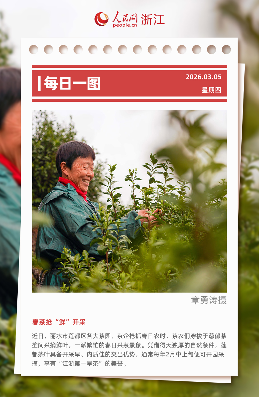 人民網麗水3月2日電 (章勇濤)今天,浙江省麗水市蓮都區各大茶園、茶企搶抓春日農時,茶農們穿梭於蔥郁茶壟間採摘鮮葉,一派繁忙的春日採茶景象。 蓮都區現有茶園總面積6.15萬畝,其中“烏牛早”品種種植面積達2.8萬畝。…