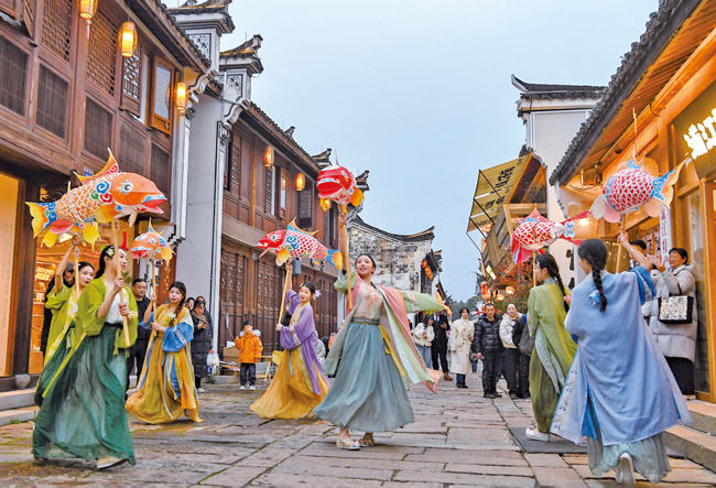 春節假期,金華浦江東街張燈結彩,洋溢著節日的喜慶氣氛。身著漢服的姑娘們手舉魚燈走街串巷,翩翩起舞歡慶新春,吸引眾多市民游客駐足觀賞。…