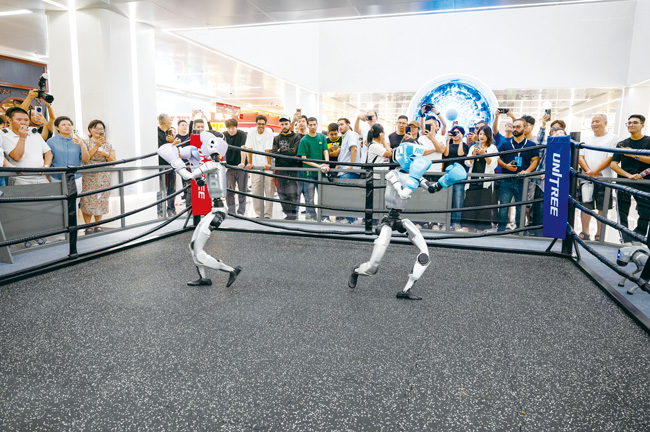 近日,義烏全球數貿中心開門迎客。開業期間,多場精彩的機器人拳擊表演賽吸引了眾多採購商和游客駐足觀賞。在拳擊擂台上,機器人動作靈活,一記記出拳、踢腿頗具“專業范”,不少人拿出手機拍攝這一科技感十足的場景。(錢旭升)