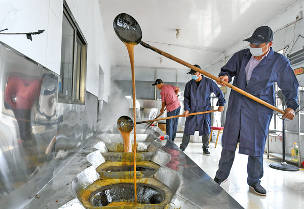 10月17日,在金華市區環城北路的一家紅糖廠內,空氣中彌漫著絲絲甜味。來自義烏市上溪鎮的師傅們揮動著長勺,以傳統技藝熬制紅糖。(時寬兵)