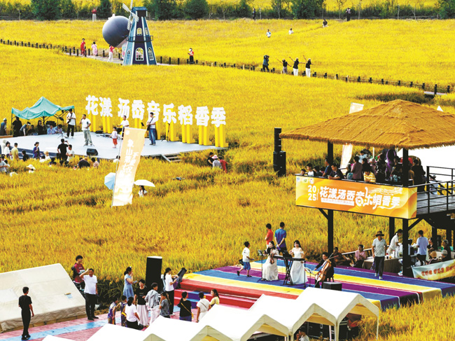 稻田之間,一場沉浸式視聽盛宴同步上演。一名9歲小游客坦言:“這是我第一次體驗農耕,終於知道農民伯伯有多辛苦。”