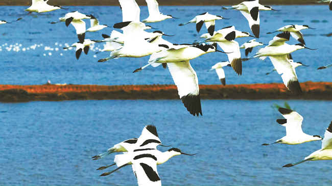10月28日,寧波前灣新區濱海濕地上演靈動一幕:反嘴鷸、野鴨等首批南遷候鳥成群而至,成千上萬隻“空中精靈”振翅翱翔,為生態新城暈染出生態底色。潔白的反嘴鷸掠過淺灘啄食底棲生物,灰褐色野鴨浮水嬉戲,群鳥起落間,與水草豐茂的濕地、澄澈的近岸水域繪就共生圖景。