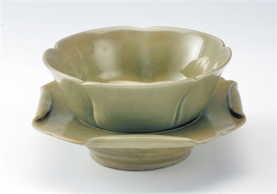 唐代越窯青釉荷葉形帶托瓷盞(見圖①)出土於寧波和義路唐代碼頭遺址。茶盞呈五曲荷花形,配套的茶托如卷邊荷葉,它通體施以溫潤的青釉,色澤如玉,完美展現了唐代越窯“千峰翠色”的巔峰工藝。考古發現,和義路一帶曾是越窯青瓷外銷的重要集散地,這件茶盞或許就是當年准備裝船出海的外貿商品。