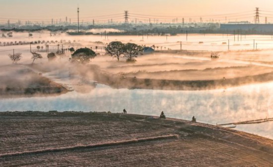 12月4日清晨,在嘉兴南湖区七星街道,丰收后的田野上晨雾如纱,如梦似幻,宛若一幅水墨江南画卷。(徐志达)。…