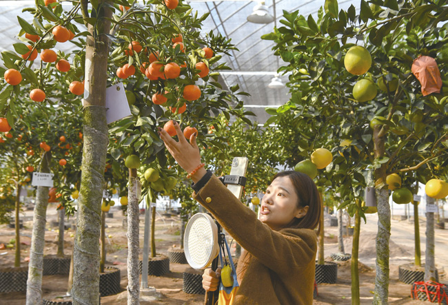 11月21日,金华市金东区澧浦镇前余村“云上果园”共富工坊里,葡萄柚、砂糖橘、暹罗红柚、木瓜蜜丁等果树上的成熟果实挂满枝头,多位主播穿行于树下,通过手机直播带着客户在线选购。(时宽兵)。…