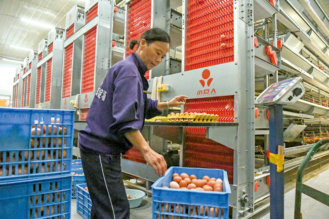 8月15日,金华兰溪市永昌街道蛋鸡养殖共富小区,村民凌寿清把刚产出的新鲜鸡蛋分拣装箱,供应市场。 蛋鸡养殖共富小区占地35.6亩,建筑占地接近1.6万平方米,内有蛋鸡房5座、育雏房1座、集蛋间1座,还有饲料间、办公楼、有机肥车间等,总投资超3000万元。…