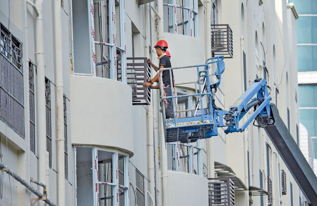 8月30日,施工人员在金华开发区三江街道江滨小区,对沿街居民楼的空调外机进行专项改造,加装统一的“外衣”。此次改造,还解决了空调外机滴水、不规范安装等问题。金华市政部门同时对沿街立面、人行道的破损,飞线等问题进行综合整治。(李建林)