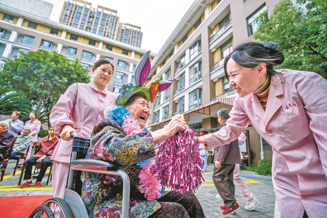10月28日,宁波市海曙区一家养老机构开展了一场特殊的重阳主题走秀活动。老人们用各种各样的装饰品打扮着自己,自信迈步、笑容满面,用灵动活力装点秋日时光,定格温暖的幸福瞬间。(徐诚、忻之承、郭素玲)