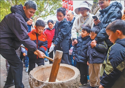 近年来,浙江省宁波市江北区依托当地特色资源,大力发展文旅产业,打造“去慈城赶集”文旅品牌。图为日前,江北区慈城古县城,游客在体验打年糕。