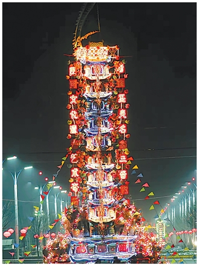 初见架火时,我便被它的独特外观所震撼:十余米高,层级分明,呼应着山西古建的端庄大气。匠人们以桌子替代厚重梁柱,用绳索绑扎代替复杂榫卯,在看似不可能中,复现了晋派建筑神韵。架火整体造型对称均衡,上下呼应,每一层装饰都错落有致。它静静矗立在村中,与周边古建相映成趣,那份喜庆与热烈,成了春节最直观的风景。